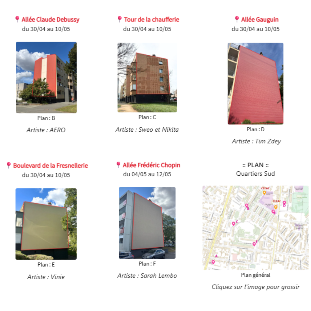 Les interventions artistiques se dérouleront entre le 30 avril et le 12 mai sur plusieurs sites du quartier :